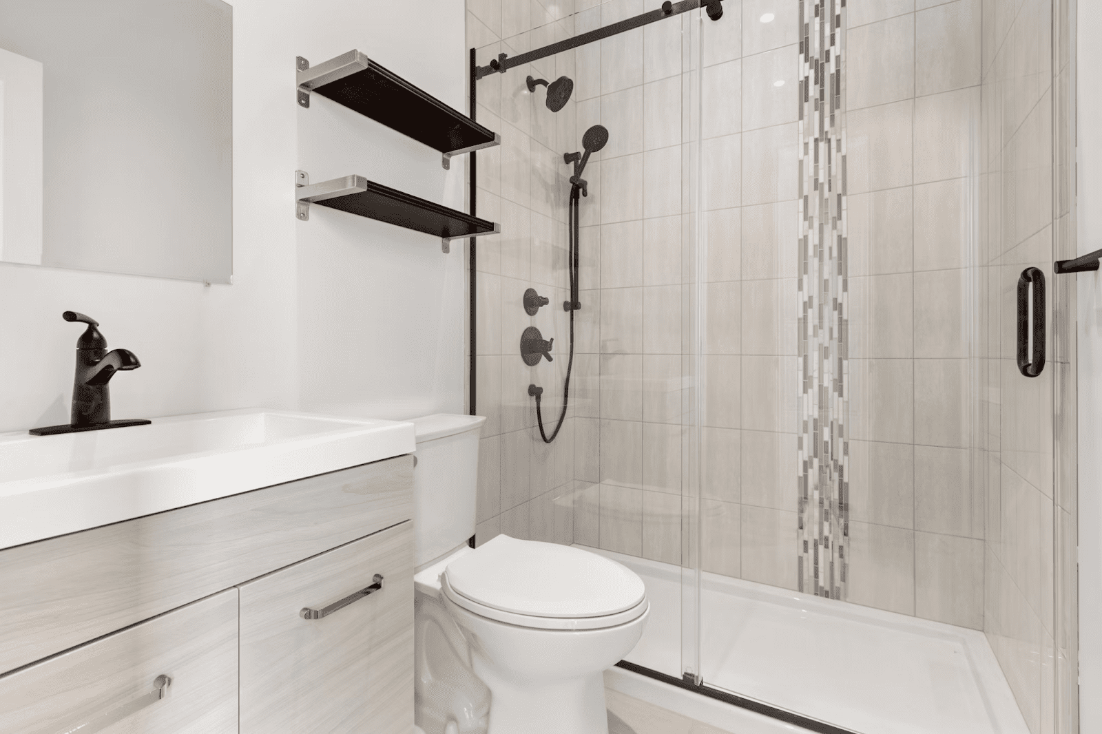 Ніші та вбудовані полиці – незамінні елементи невеликих та середніх ванних кімнат. Їх можна розміщувати над унітазом та пральною машиною, у душовій зоні та в кутку біля умивальника. Часто під нішу використовується простір усередині стін, що звільняє місце у самому приміщенні. Такі конструкції виглядають акуратно та стильно, не захаращують інтер’єр та дозволяють тримати під рукою косметику, миючі засоби та предмети гігієни. Відмінні варіанти для обробки ніш – скло, керамічна плитка та мозаїка.